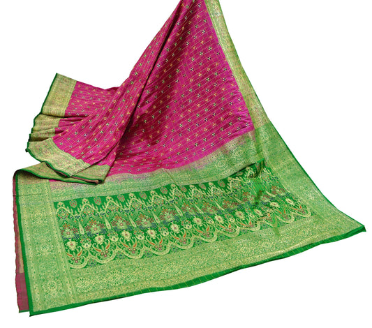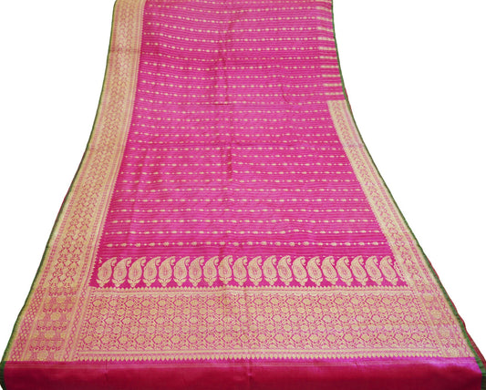 Vintage Sari Rani Pink & Green Heavy Pure Satin Silk Woven Banarasi Brocade Saree Golden Zari 5Yd Dress making Bridal/wedding Sari Crafting
