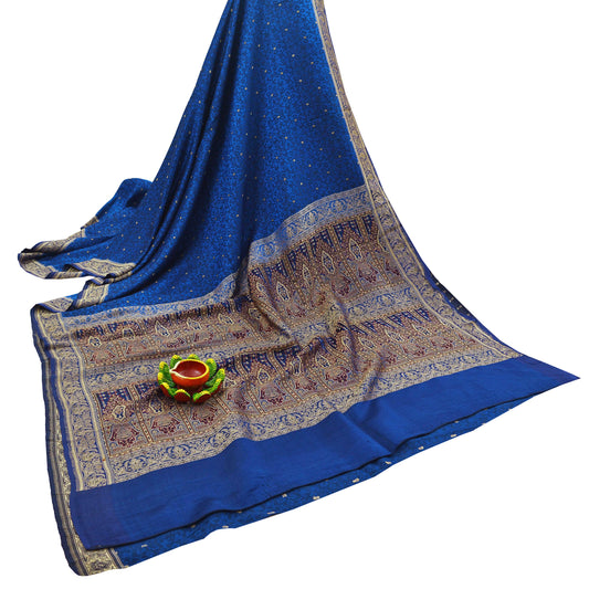 Indian Vintage Heavy Wedding Sari Blue Pure Satin Silk Woven Banarasi Tanchoi Sarees 5Yd Ethnic Craft Fabric Upcycle Bridal Sarees Upcycle