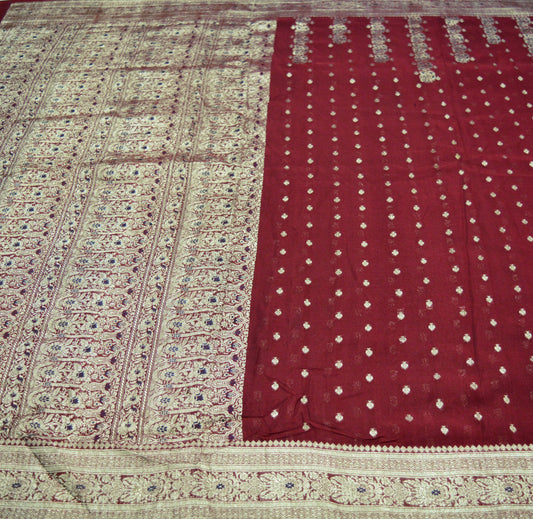 Indian Vintage Sari Maroon Heavy Wedding Pure Satin Silk Woven Banarasi Tanchoi Saree 5Yd Ethnic Craft Fabric Upcycle Bridal Heavy Sarees