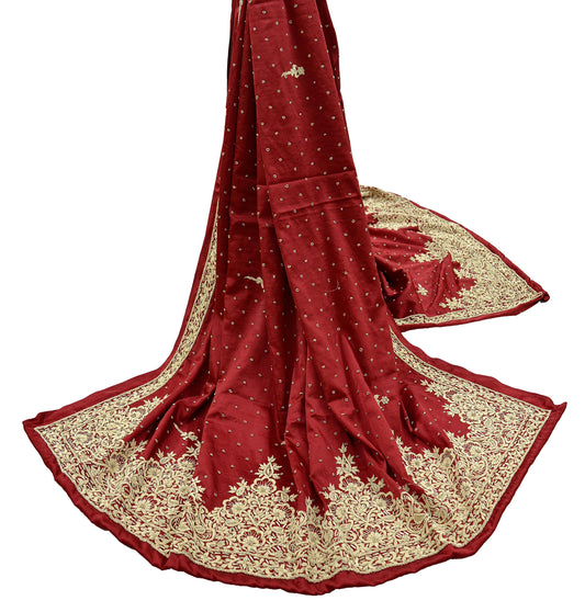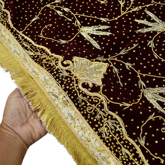 Indian Vintage Heavy Maroon Dupatta Velvet Long Stole Hand Embroidered Scarves Golden Zardozi Zari Sequins Mirror Wedding Veil Bridal Wear