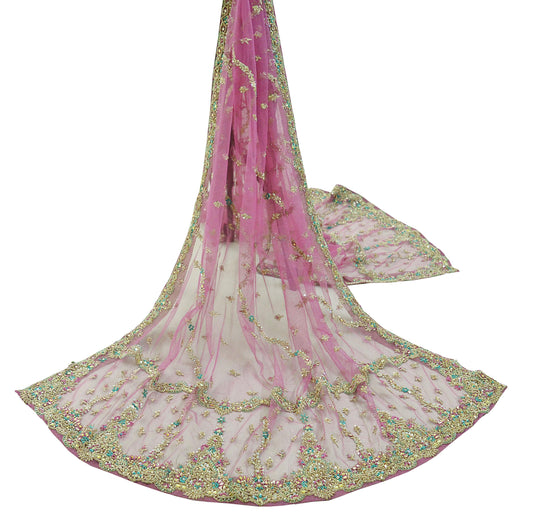 Indian Vintage Heavy Pink Dupatta Net Mesh Long Stole Hand Embroidered Scarves Silver Zardozi Dabka Zari Sequins