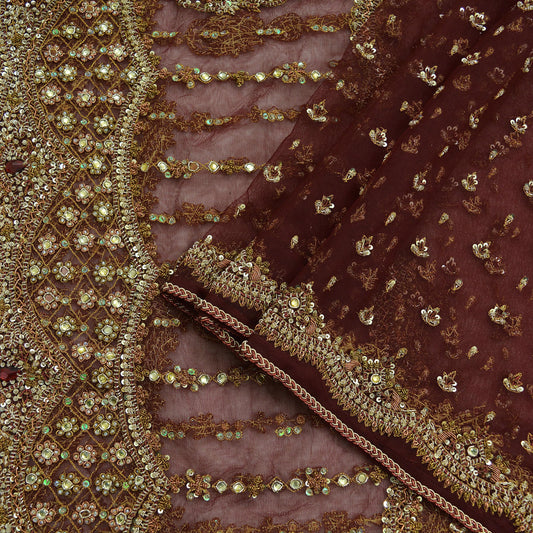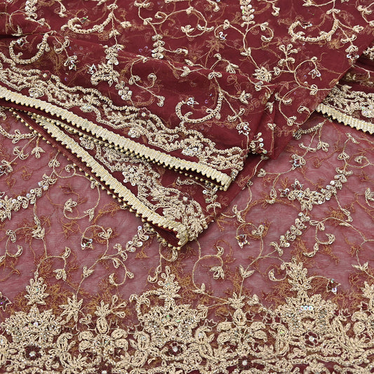 Indian Vintage Heavy Wedding Maroon Dupatta Net Mesh Long Stole Hand Embroidered Scarves Golden Zardozi Zari Sequins Dridal Veil Hijab