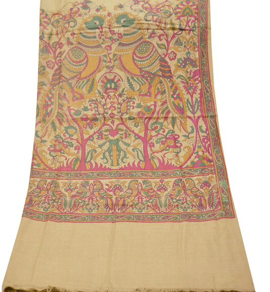 Vintage Indian Long Kalamkari Print Woolen Shawl Beige Stole Peacock Veil Woman Hijab Shawl Warm Soft