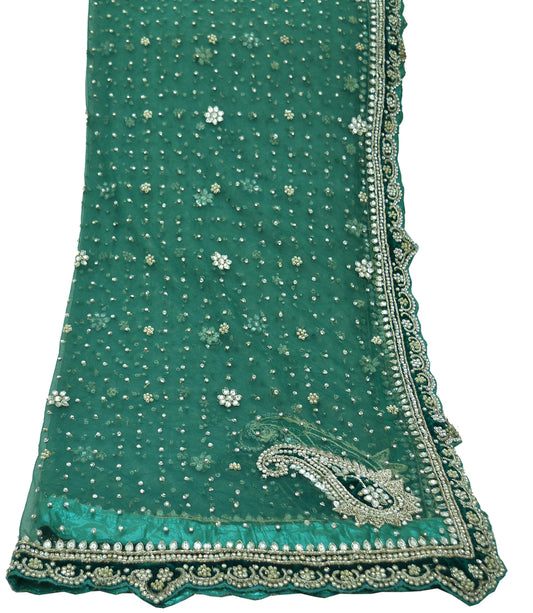 Indian Vintage Heavy Bottle Green Dupatta Net Mesh Long Stole Hand Embroidered Scarves Golden Zardozi Zari Sequins