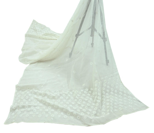Indian Vintage White Dupatta Long Stole Pure Cotton Handmade Mukesh & Chikankari Scarves Veil Scarf Wrap Hippie Boho Soft