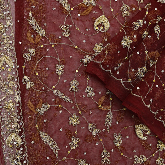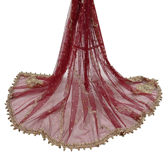 Indian Vintage Heavy Maroon Dupatta Net Mesh Long Stole Hand Embroidered Scarves Golden Zardozi Zari Sequins Stole