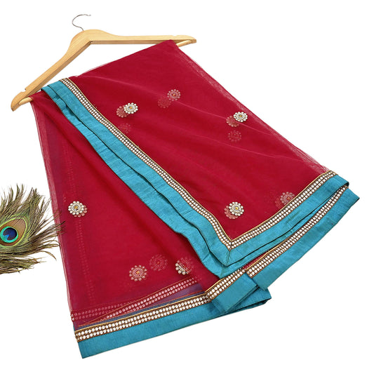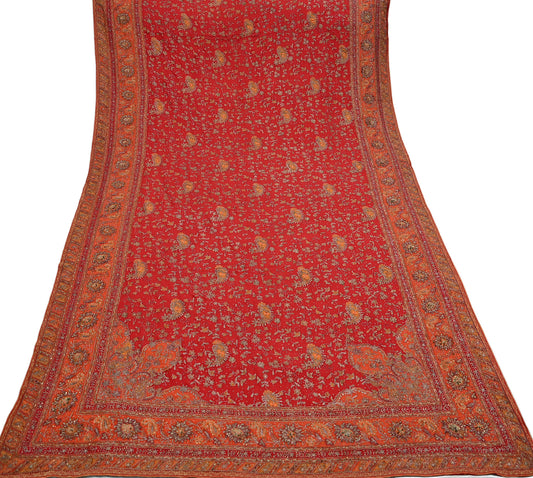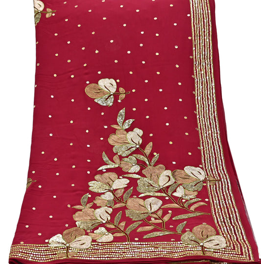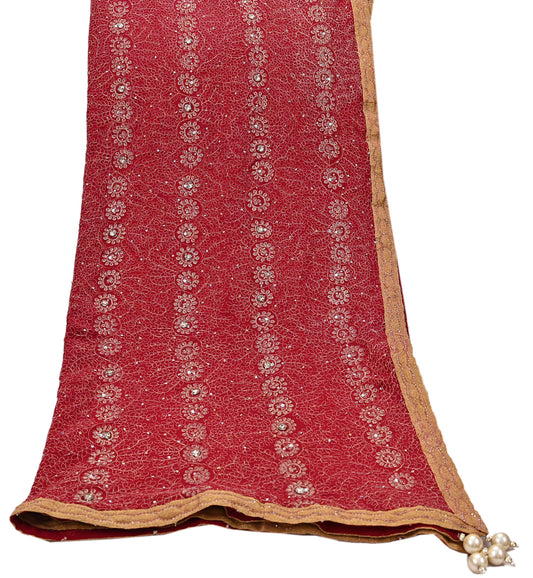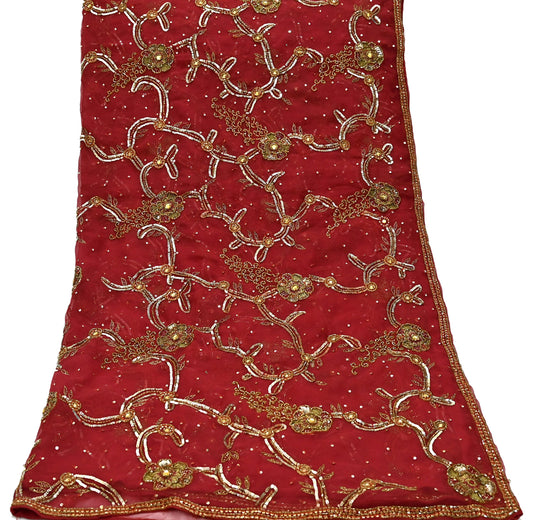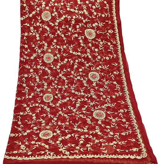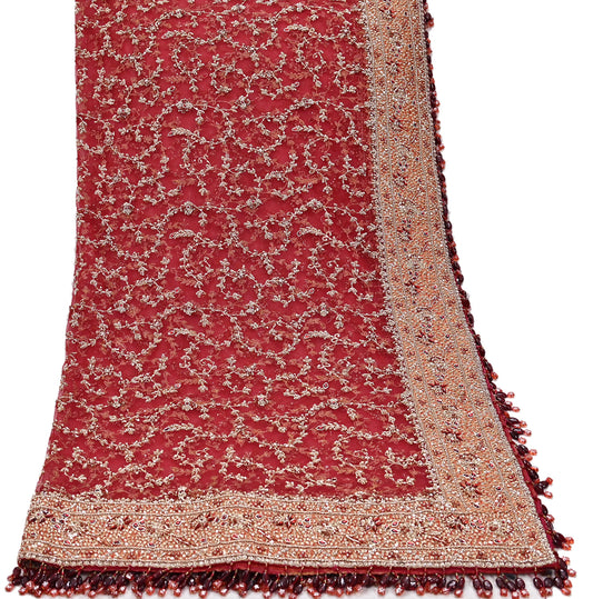 Indian Vintage Heavy Red Dupatta Pure Georgette Silk Long Stole Hand Embroidered Scarves Glass Beaded