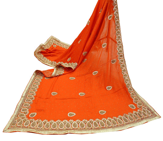 Indian Women Vintage Heavy Orange Dupatta Pure silk Long Stole Hand Embroidered Hijab Scarves Veil Wrap Zardozi Dabka Gota patti
