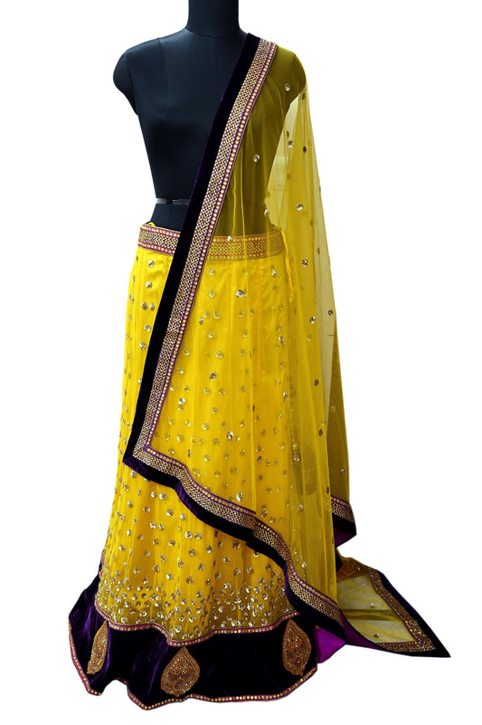 Indian Vintage Yellow Net/Mesh Hand Embroidered Lehenga/Dupatta 2pcs Set Bridal Party Wear Bollywood Lehenga Zardozi/ Dabka