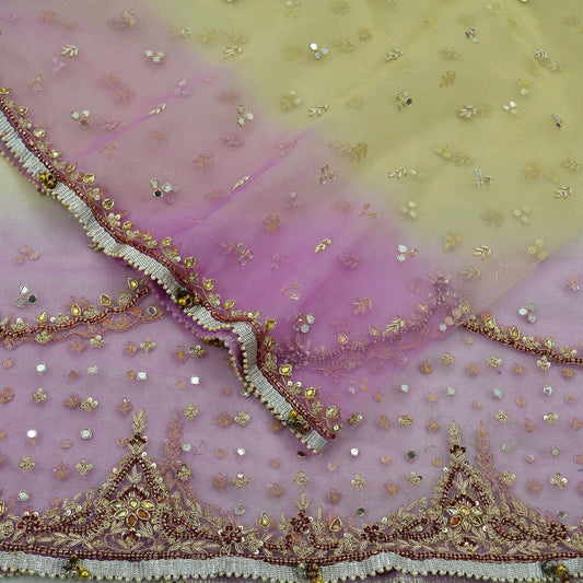 Indian Vintage Purple & Yellow Dupatta Net Mesh Long Stole Hand Embroidered Scarves Golden Zardozi Zari Sequins Veil Hijab Scarf