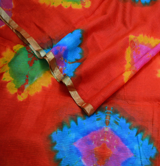Indian Vintage Red Dupatta Long Stole Hand Tie-Dye Print Pure Chanderi Silk Indian Scarves Veil Golden Zari