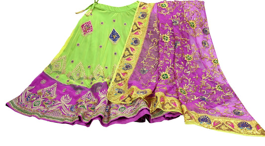 Indian Vintage Magenta & Green American Georgette Hand Embroidered Rajputi Phoshak Lehenga/Dupatta 2pcs Set Bridal Party Wear Peacock Design