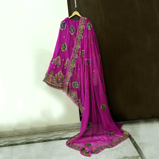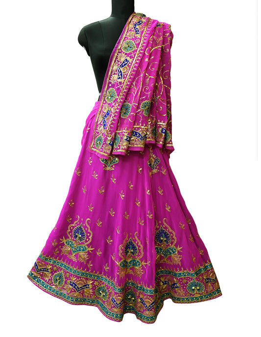 Indian Vintage Magenta American Georgette Hand Embroidered Rajputi Phoshak Lehenga/Dupatta 2pcs Set Bridal Party Wear Peacock Design Zari