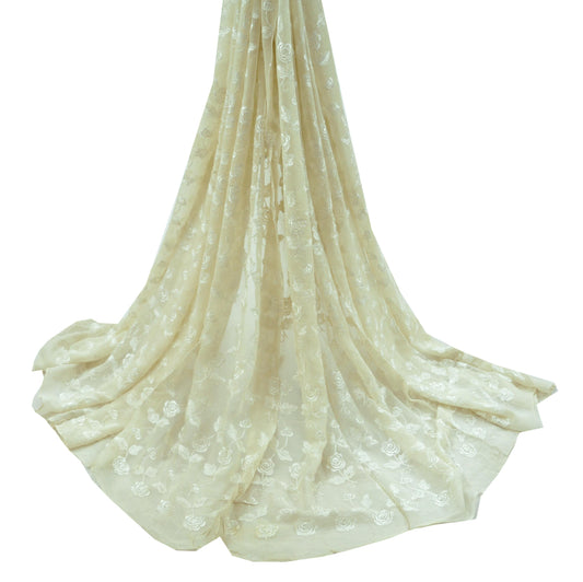 Indian Vintage Ivory Dupatta Pure Chiffon Silk Long Stole Embroidered Scarves Floral Design Stole Veil Wrap