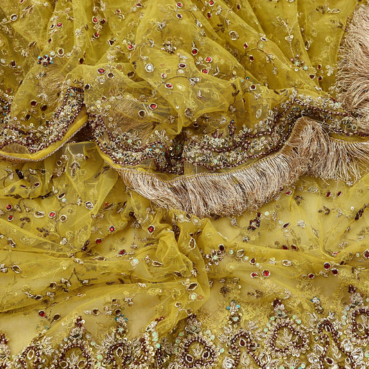 Indian Vintage Heavy Yellow Dupatta Net Mesh Long Stole Hand Embroidered Scarves Golden Zardozi Zari Beaded Stole