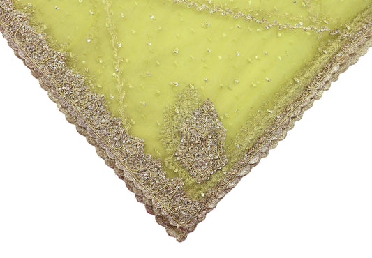 Indian Vintage Neon Green Dupatta Net Mesh Long Stole Hand Embroidered Scarves Golden Zardozi Zari Sequins Hijab Veil wrap Boho