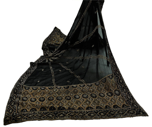 Indian Vintage Heavy Wedding Black Dupatta Net Mesh Long Stole Hand Embroidered Scarves Golden Zardozi Zari Sequins Dridal Veil Hijab