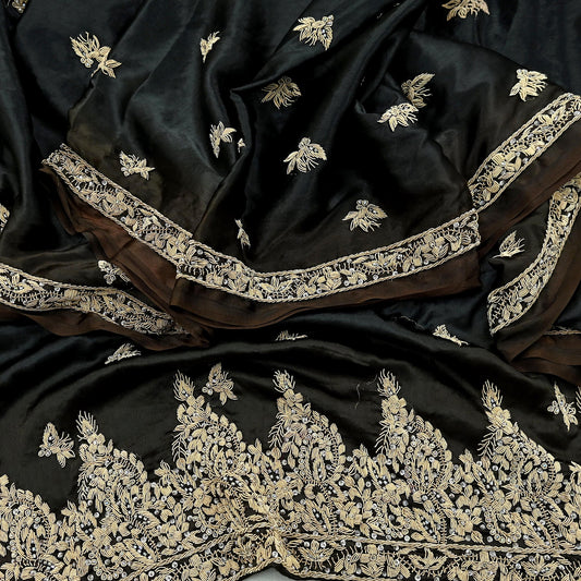 Indian Vintage Heavy Wedding Black & Brown Dupatta Pure Satin Silk Long Stole Hand Embroidered Scarves Golden Zardozi Veil
