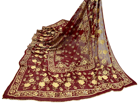 Indian Vintage Dupatta Maroon Long Stole Pure Georgette Silk Hand Embroidered Scarves Veil Hijab Floral Sequins