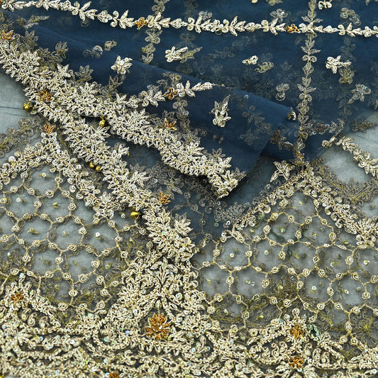 Indian Vintage Gray Dupatta Net Mesh Long Stole Hand Embroidered Scarves Golden Zardozi Zari Hijab Veil wrap Boho