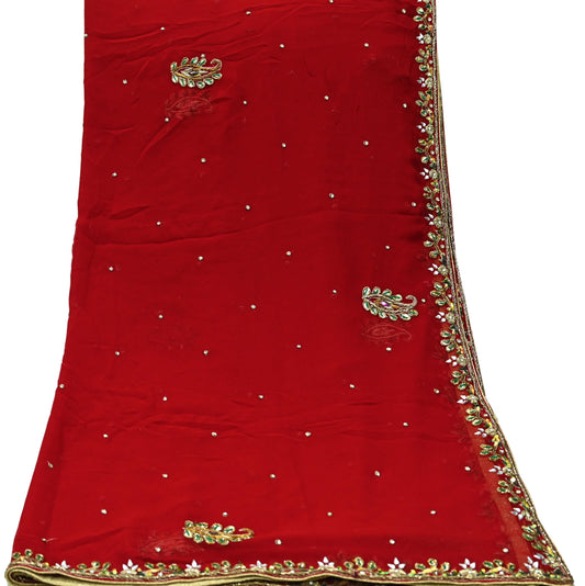 Indian Vintage Dupatta Red Long Stole Pure Georgette Silk Hand Embroidered Scarves Veil Hijab Floral Zari Dabka Zardozi