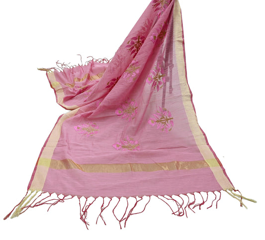 Indian Vintage Dupatta Pink Long Stole Hand Woven Chanderi Scarf Veil Soft Floral Zari Fringes