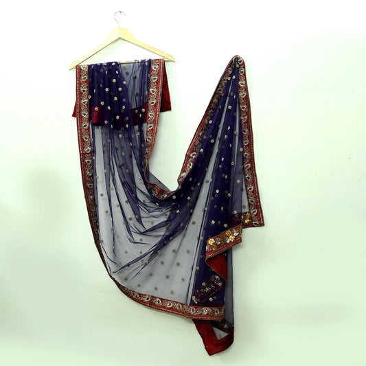 Indian Pre-owned Heavy Dupatta Blue Net Long Stole Hand Embroidered By Designer Abu Jani Scarves Bridal Veil