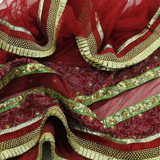 Indian Vintage Heavy Bridal Dupatta Maroon Net Mesh Long Stole Hand Embroidered Scarves Patti Wedding/Party Wear