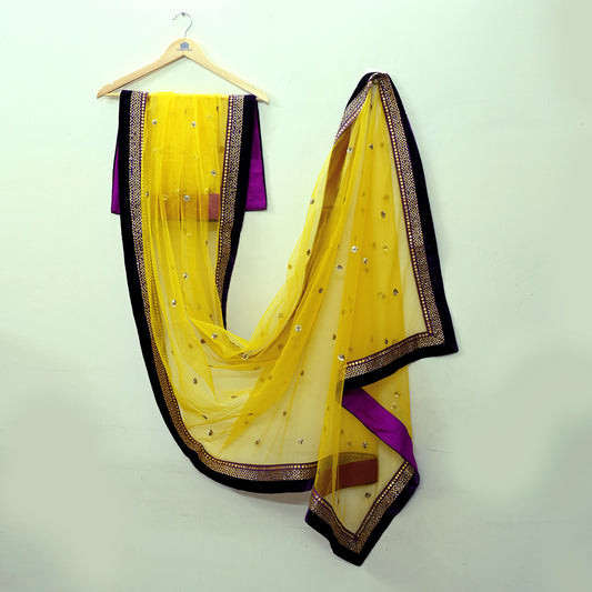 Indian Vintage Heavy Bridal Dupatta Yellow Net Mesh Long Stole Hand Embroidered Scarves Wedding/Party Wear