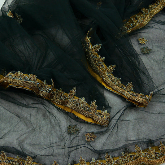 Indian Vintage Black Dupatta Net Mesh Long Stole Hand Embroidered Scarves Golden Zardozi Zari Sequins Hijab Veil wrap Boho