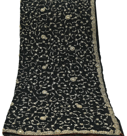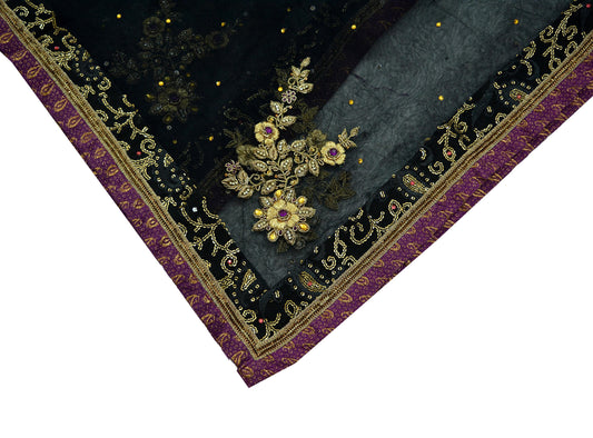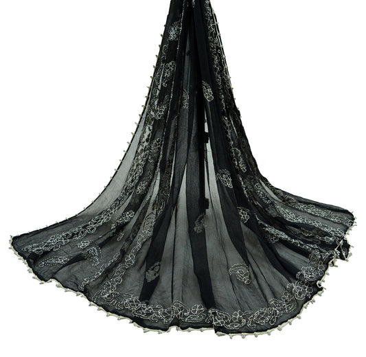 Indian Vintage Black Dupatta Pure Chiffon silk Long Stole Hand Embroidered Scarves Floral Design Stole Veil Wrap Zari Zardozi