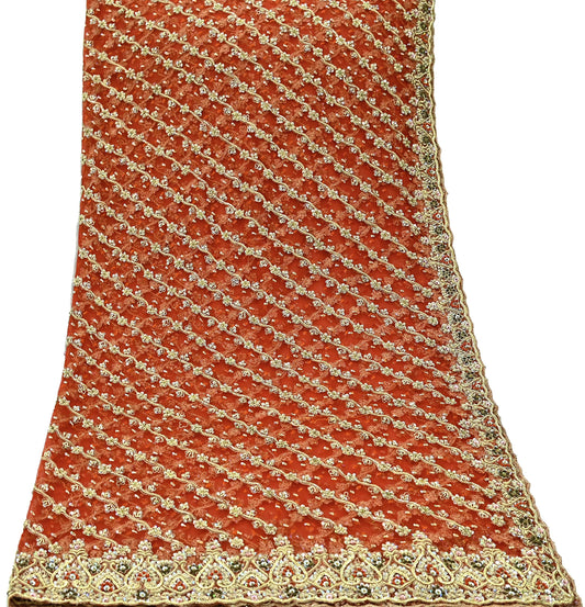 Indian Vintage Bridal Heavy Orange Dupatta Net Mesh Long Stole Hand Embroidered Scarves Golden Zardozi Dabka Zari Sequins Wedding Veil
