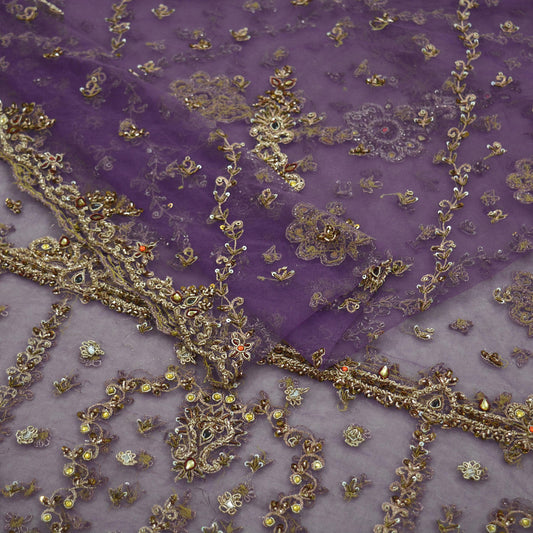 Indian Vintage wedding Hand Embroidered Purple Net Dupatta Zardozi Stole Veil Hijab Bridal