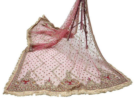 Indian Vintage Heavy Pink Dupatta Net Mesh Long Stole Hand Embroidered Scarves Golden Zardozi Dabka Zari Sequins Wedding Dupatta Party Wear
