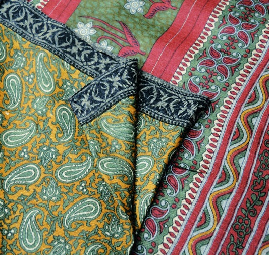 Indian Vintage Green & Mustard Heavy Saree Woven Printed 100% Pure Woolen Indian Sari Fabric 6Yard Indian Sari Soft