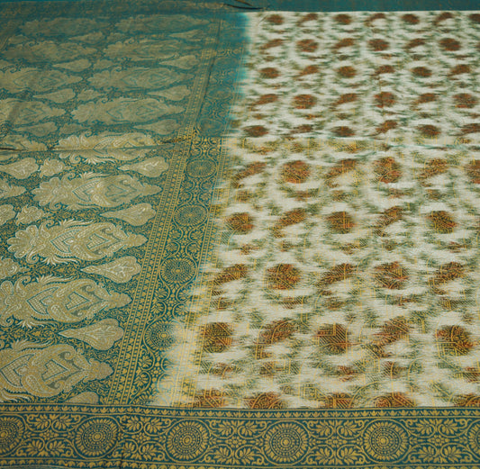 Indian Vintage Green & Gray Heavy Saree Pure Silk Hand Woven ikat Sari 5yd Zari Ethnic Fabric Craft Floral