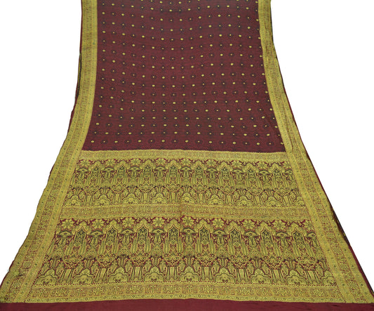 Indian Vintage Sari Maroon & Green Heavy Wedding Pure Satin Silk Woven Banarasi Brocade Saree Zari 5Yard