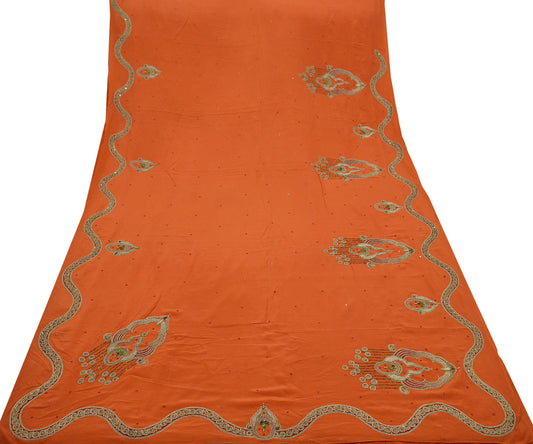 Indian Vintage Heavy Sarees Orange Pure Crepe Silk Hand Embroidered Sari Craft Fabric 5Yd Sewing Zardozi/Dabka Dress making Wedding Sari
