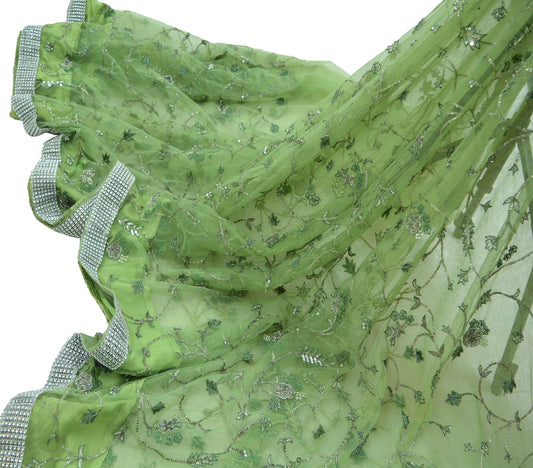 Indian Vintage Heavy Saree Green Net/Mesh Hand Embroidered Sari Fabric 5Yd Sewing Soft Zardozi/Dabka Zari Sequins