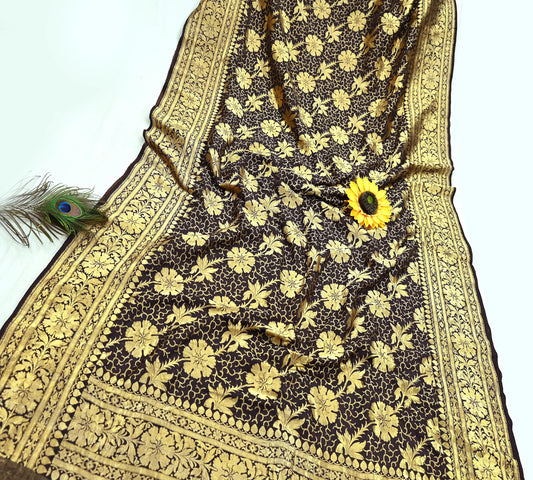 64 years old Indian Antique Vintage Heavy Wedding Sari Brown Pure Silk Hand Woven Banarasi Sarees Zari 5Yd Pre-owned Dress Designing