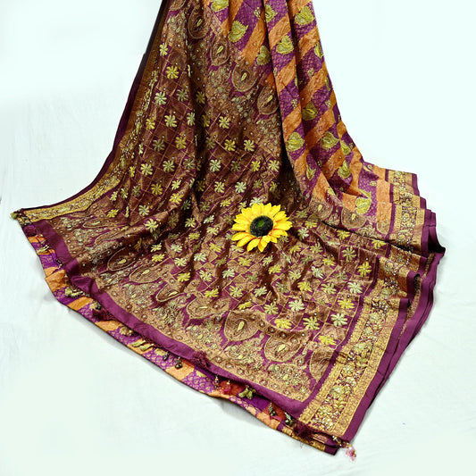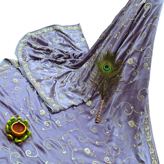 Indian Vintage Heavy Saree Purple 100% Pure Satin Silk Hand Embroidered Sari Fabric 6Yd Sewing Soft Zardozi/Dabka Dress Making Quilting