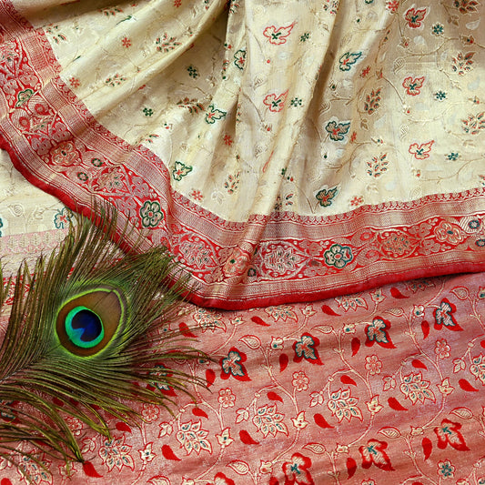 Indian Antique Vintage Heavy Wedding Sari Red & White Pure Satin Silk Hand Woven Banarasi Sarees Zari 5Yd Floral Pre-owned Designing