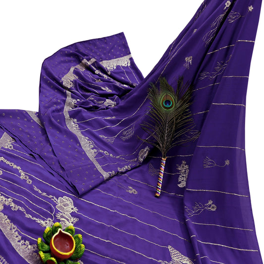 Indian Vintage Heavy Sarees Purple Pure Crepe Silk Hand Embroidered Sari Craft Fabric 5Yd Sewing Zardozi/Dabka Dress making