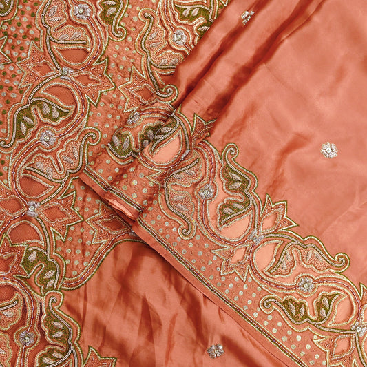 Indian Vintage Heavy Peach Sari Hand Embroidered Saree 100% Pure Satin Silk Craft Fabric 5yd Soft Dress making Wedding/Party Wear Zardozi
