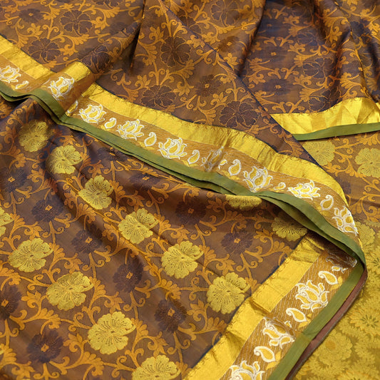 Indian Vintage Heavy Green & Mustard Kanjivaram Saree 100% Pure Silk Sari Zari 6Yd Floral Crafting Dress making Crafting Quilting