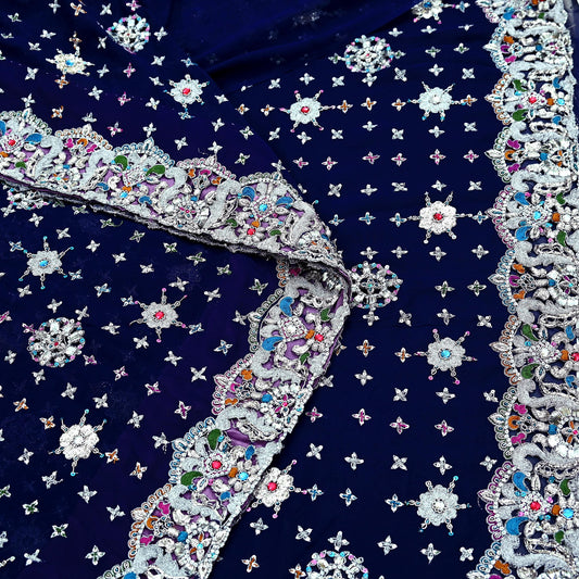 Indian Vintage Heavy Sari Blue Pure Georgette Silk Hand Embroidered Sarees Craft Fabric 5Yd Sewing Ethnic Zardozi/dabka zari Wedding sarees