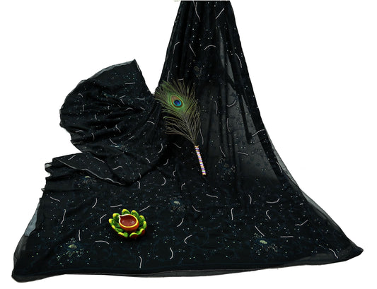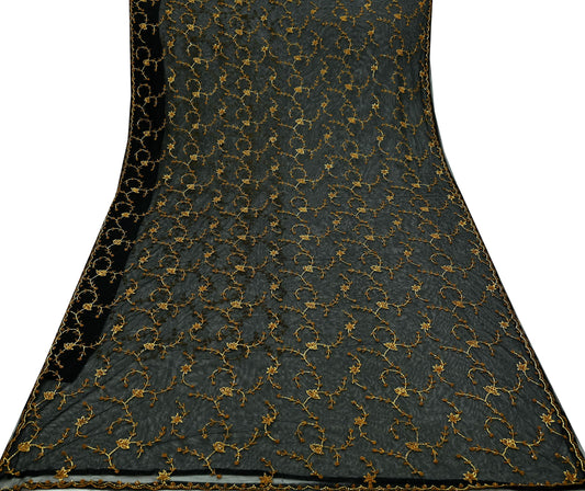 Indian Vintage Heavy Sari Black Pure Georgette Silk Hand Embroidered Sarees Fabric 6Yd Sewing Soft Ethnic Dress making Crafting Quilting