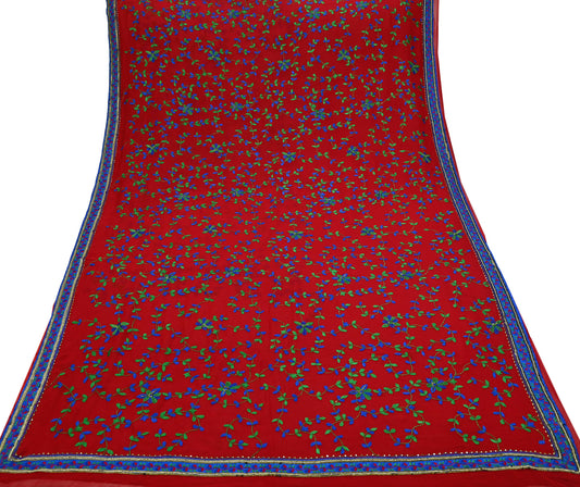 Indian Vintage Heavy Sari Red & Blue Pure Georgette Silk Hand Embroidered Sarees Craft Fabric 5Yd Sewing Ethnic