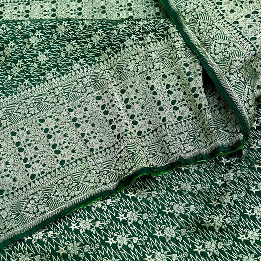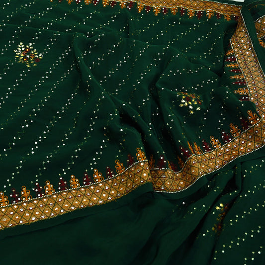 Indian Vintage Heavy Sari Green Pure Crepe Silk Hand Embroidered Sarees Craft Fabric 5Yd Sewing Zardozi Dress making With Blouse Pcs