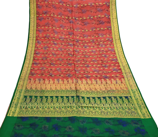 Indian Vintage Green & Orange Heavy Wedding Saree Pure Satin Silk Woven Brocade Banarasi Sarees Sari Fabric Golden Zari 5Yd